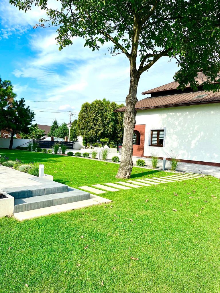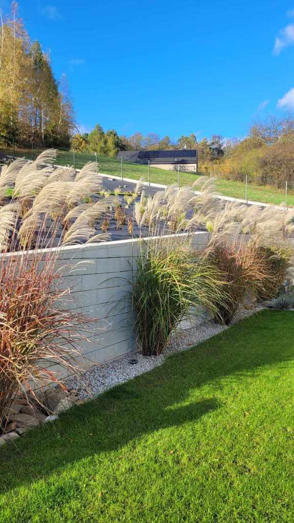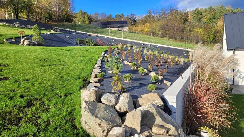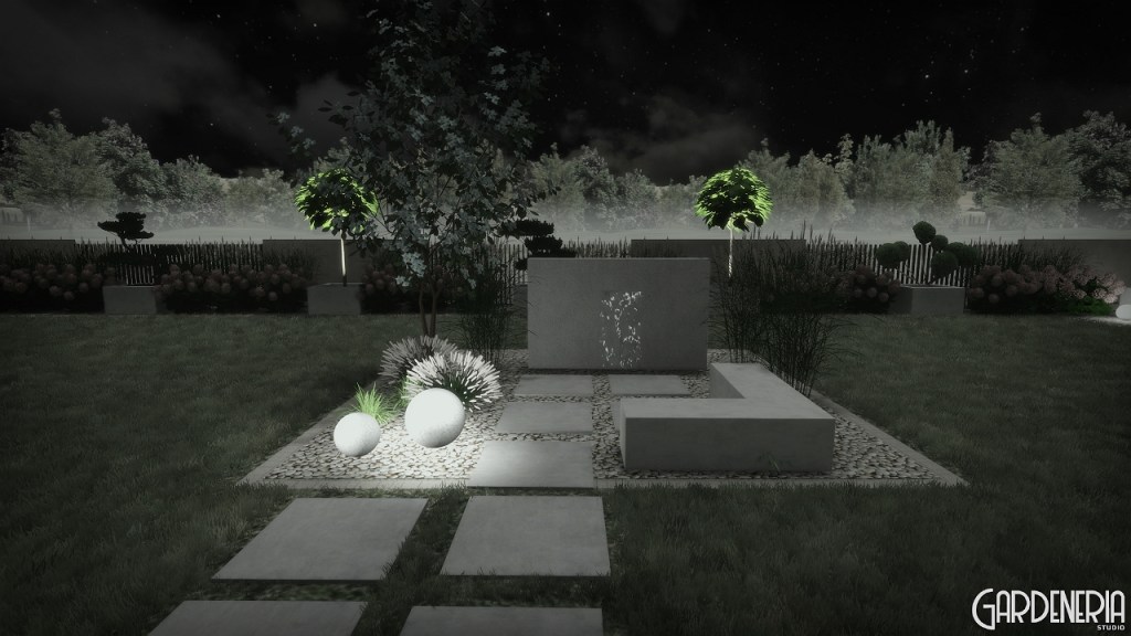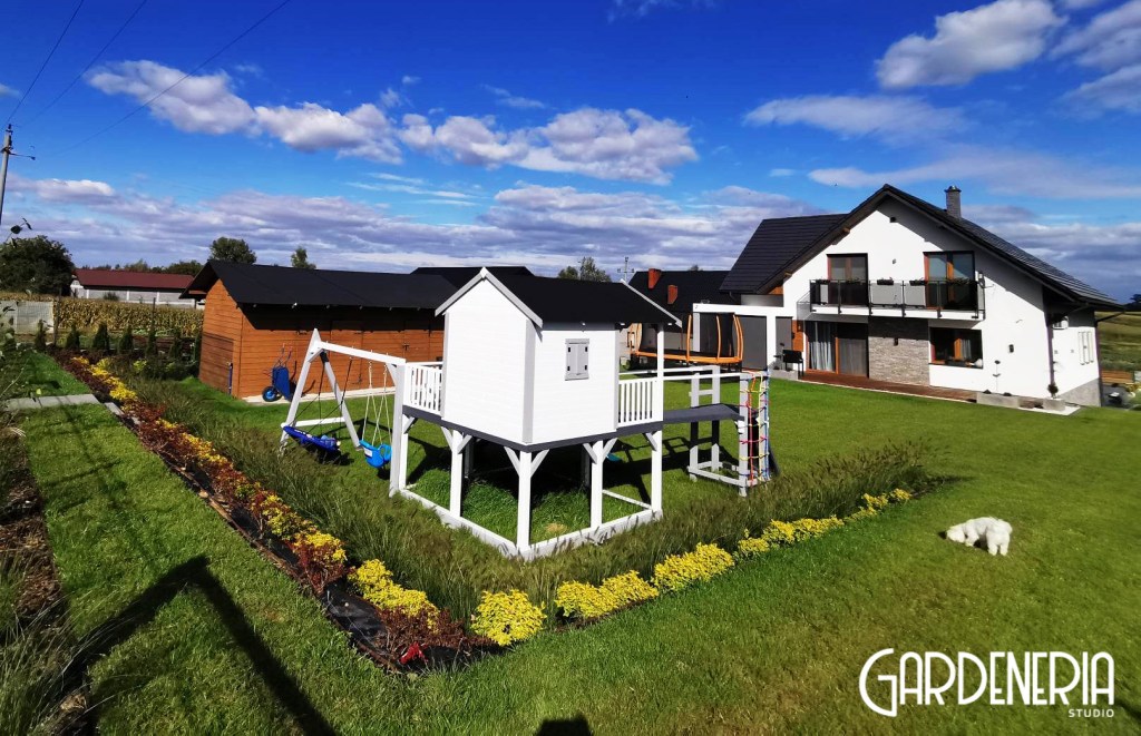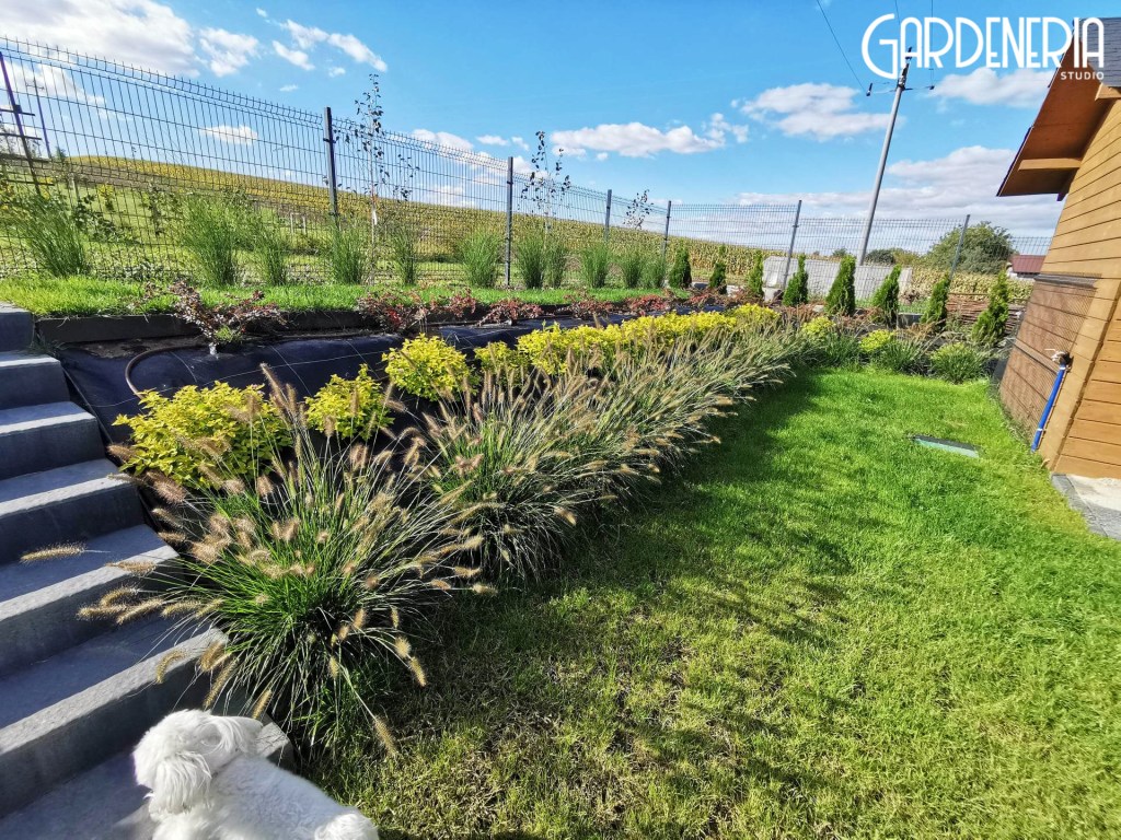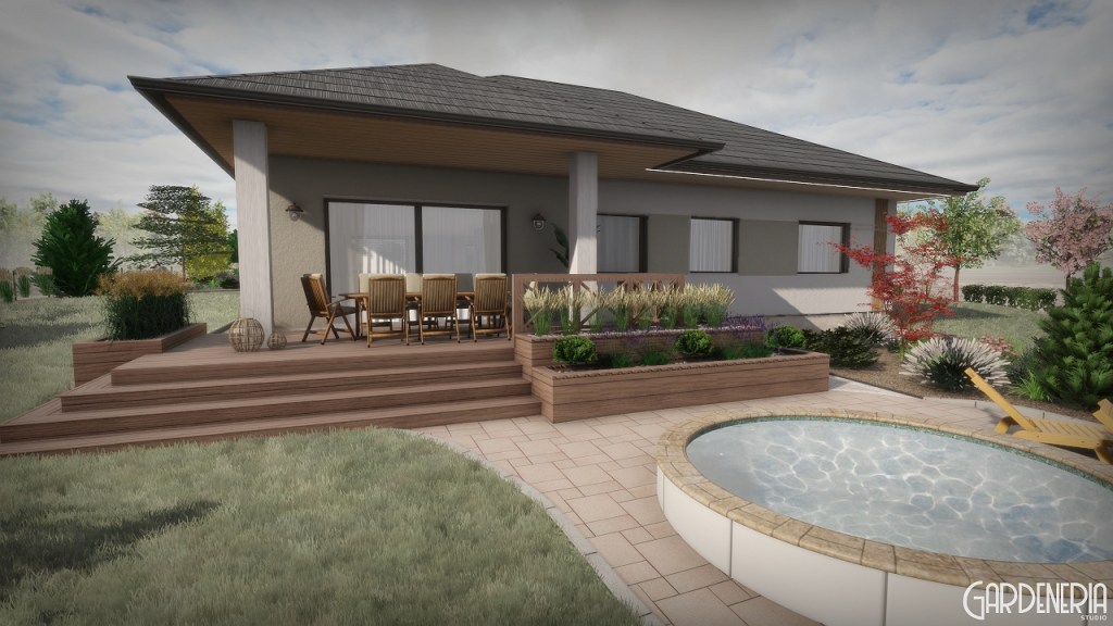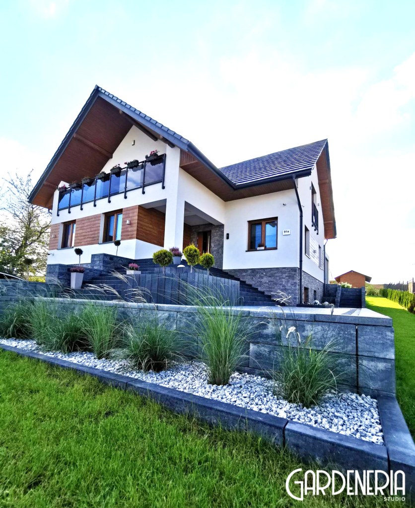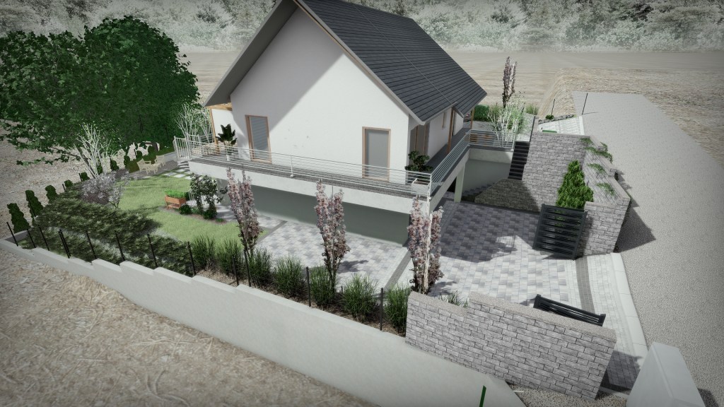 Projekt niewielkiego ogrodu przy domu jednorodzinnym. Łączna powierzchnia ogrodu wynosiła około 4 arów. Ze względu na interesujące ukształtowanie terenu w ogrodzie zaprojektowane zostały schody terenowe oraz palisady. Pod balkonem zagospodarowano przestrzeń pod altanę, do której będą prowadziły kręcone schody. W projekcie przewidziane zostało miejsce na basen i taras tuż obok niego. Zaprojektowano ścieżki z płyt betonowych oraz oświetlenie ogrodowe. Skarpy obłożone zostały kamieniem i obsadzone sosną górską – kosówką. Cały ogród ma nowoczesny i minimalistyczny styl.