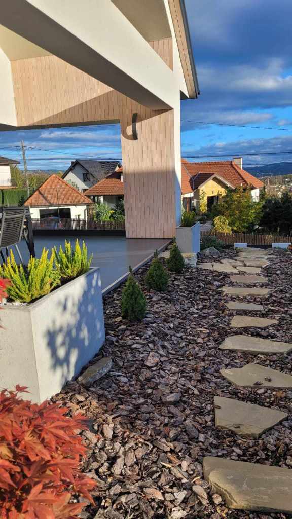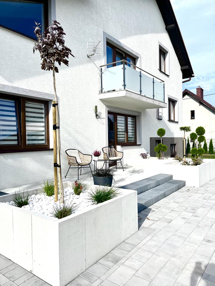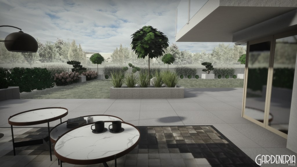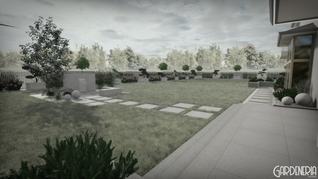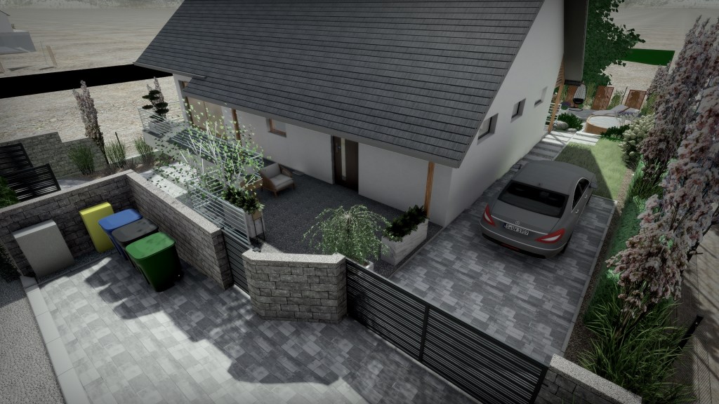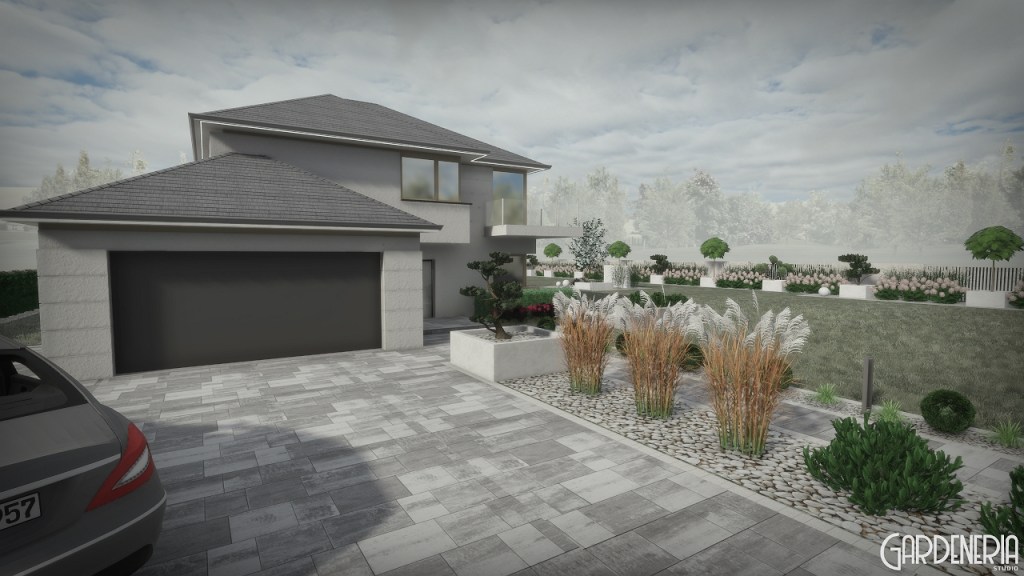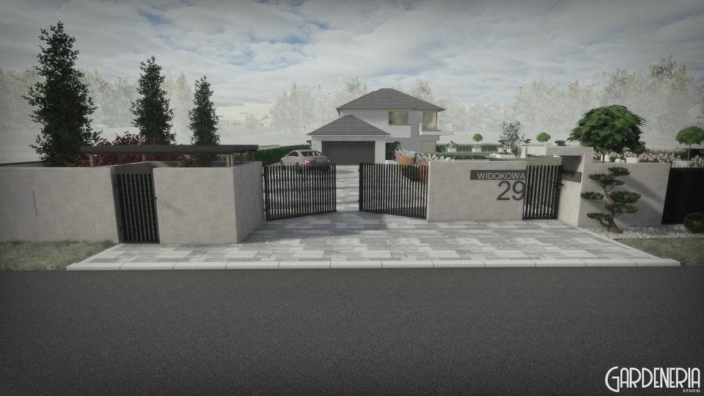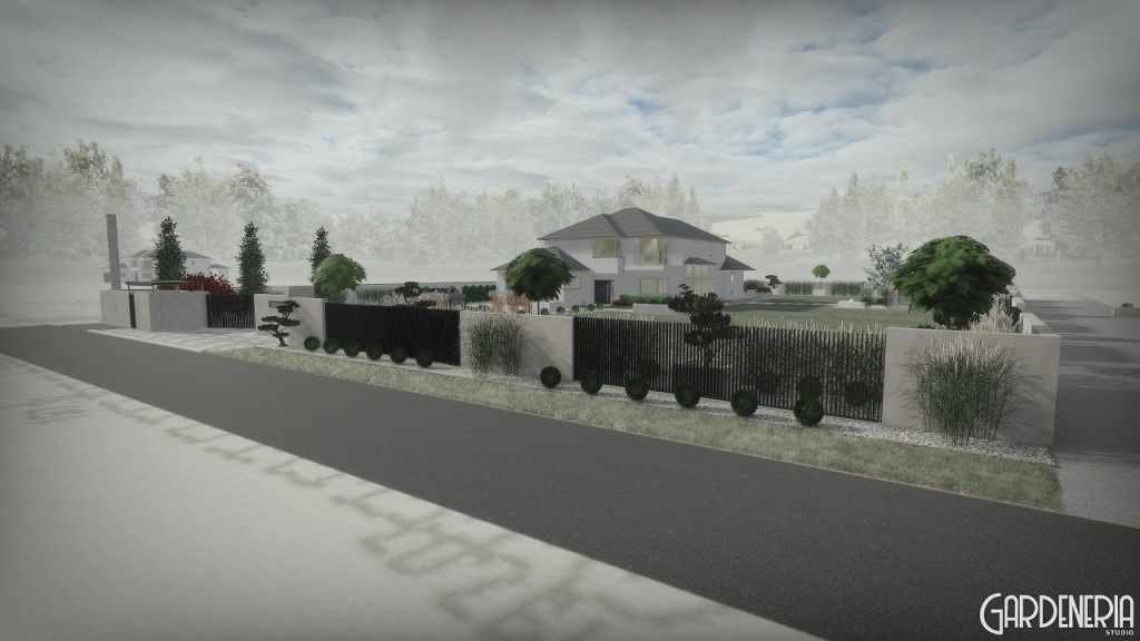 Projekt przedstawiony poniżej składa się z projektu ogrodzenia, projektu podjazdu, projektu tarasu i dobór roślinności. Zgodnie z wytycznymi na wizualizacji zastosowane zostały płyty o większym formacie w stonowanych odcieniach szarości. Ogrodzenie palisadowe ma lekką i bardzo nowoczesną formę, którą równoważą murki wykończone spiekami kwarcowymi. Taras wykonany będzie z płyt ceramicznych o grubości 2 cm. Wzdłuż ogrodzenia zaprojektowano wielkoformatowe donice na drzewa o kulistej koronie i bonsai.