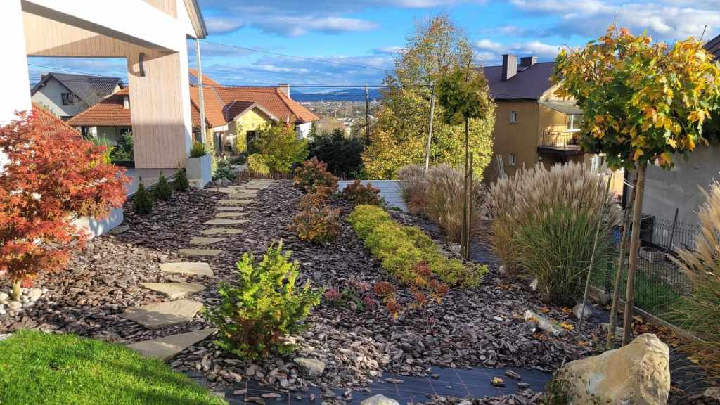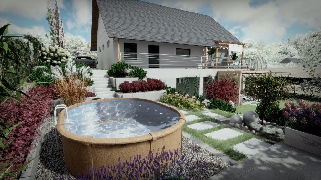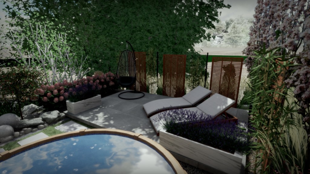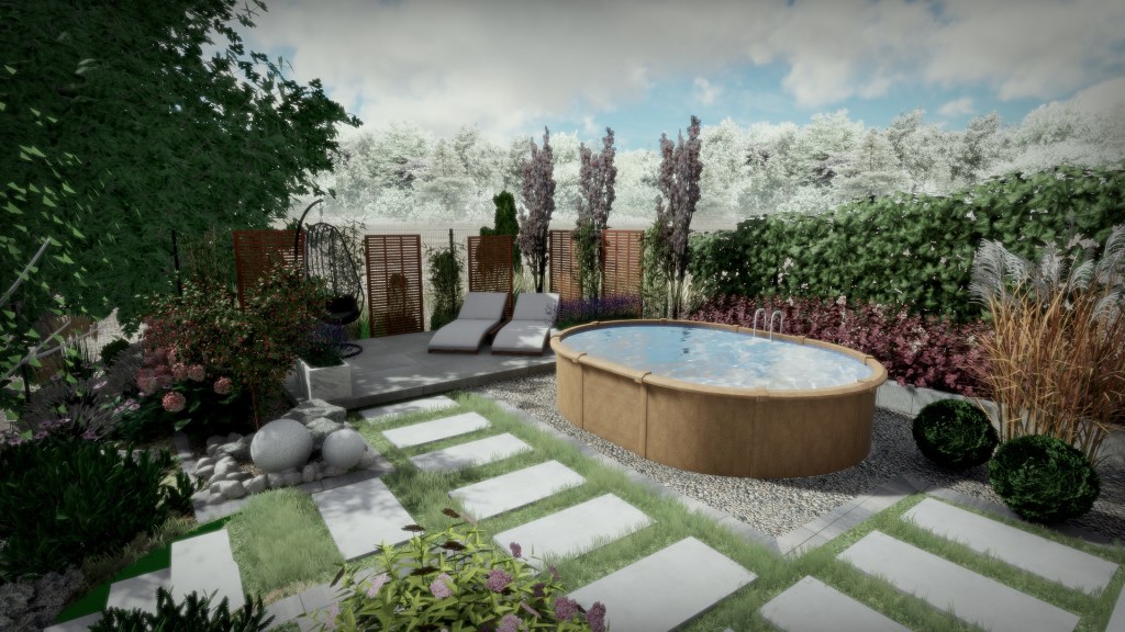 Mały ogród z basenem i dużym zróżnicowaniem ukształtowania terenu